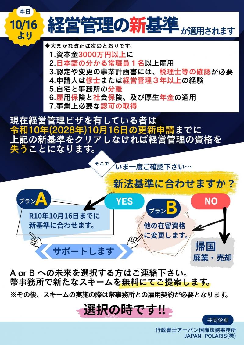 The requirements for the “Business Manager” residence status under the Immigration Control Act have been revised starting today! As a result, the asset requirement has been raised to 30 million yen or more, among other major changes. Please refer to the attached PDF for details. If you are considering preparing a new business plan that meets the revised requirements, please feel free to contact us for assistance.